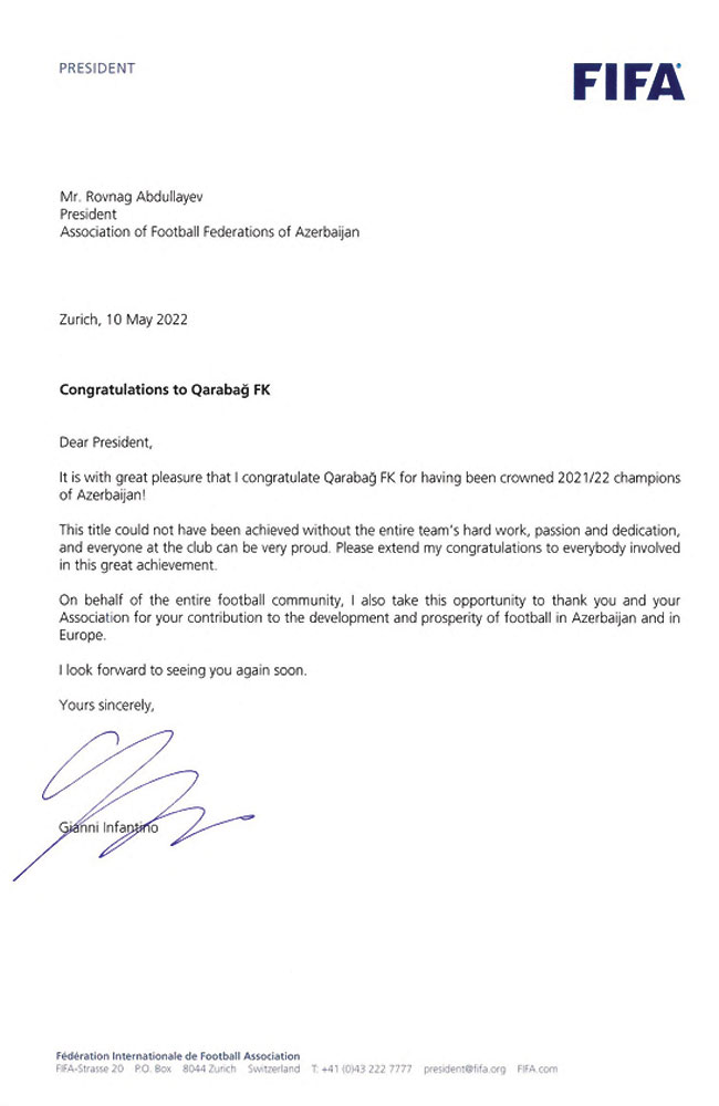FIFA-nın prezidenti Gianni İnfantino Azərbaycan Futbol Federasiyaları Assosiasiyasının prezidenti Rövnəq Abdullayevə ünvanladığı məktubla "Qarabağ" Futbol Klubunu Azərbaycan Premyer Liqasının 2021/2022-ci il mövsümünün qalibi olması münasibətilə təbrik edib. Məktubun məzmununu diqqətinizə çatdırırıq: