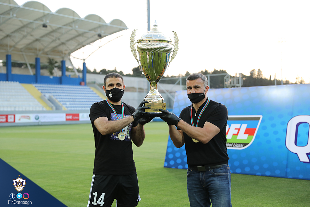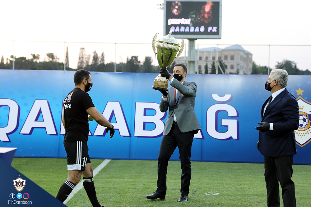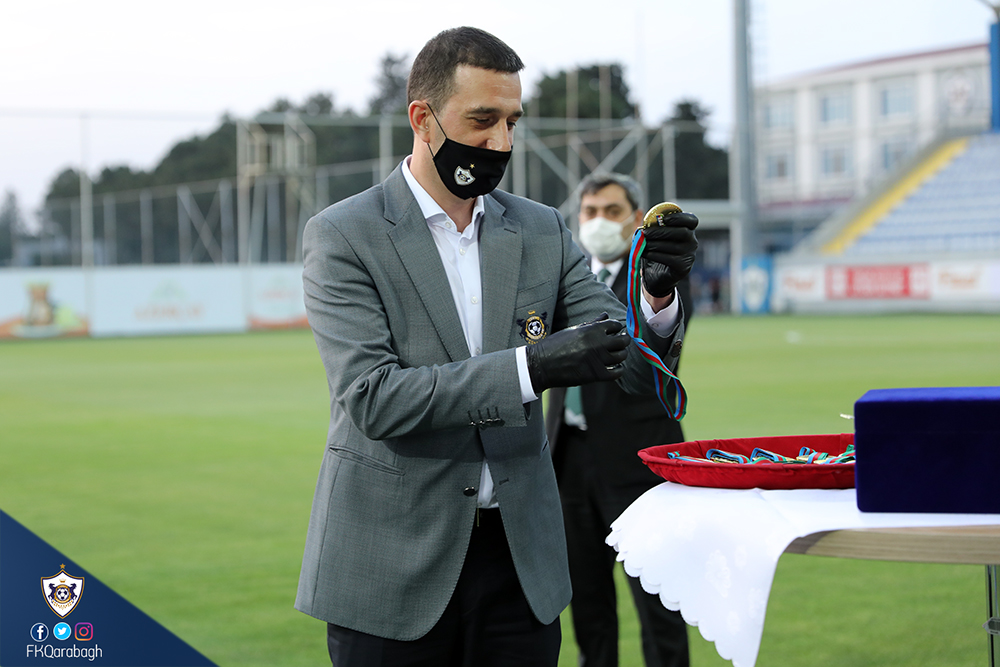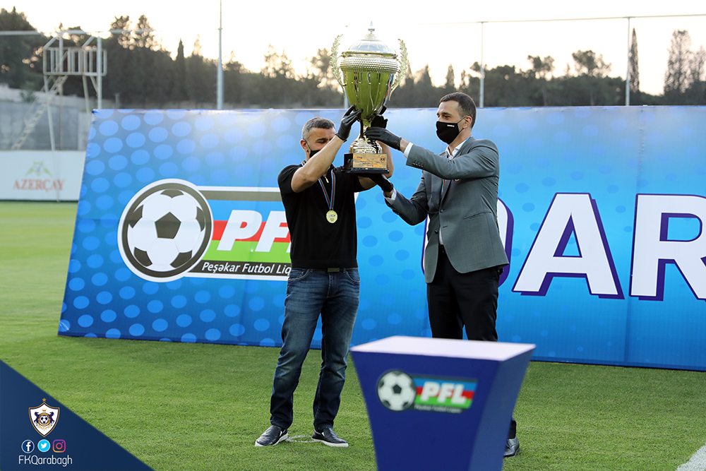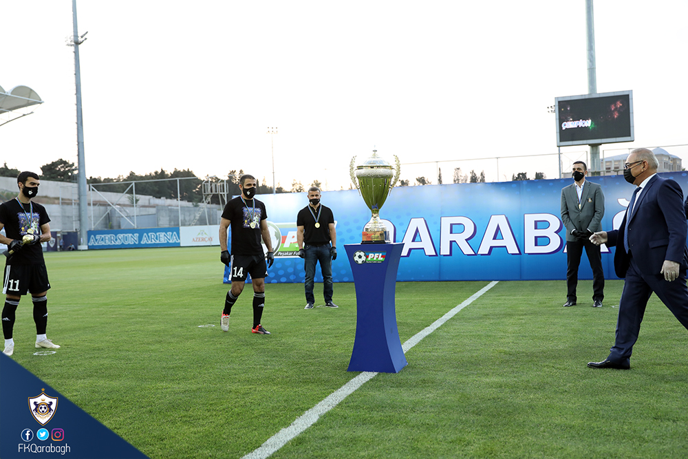 Bir neçə gün öncə Azərbaycan çempionluğunu rəsmiləşdirən Qarabağ Futbol Klubu bugün mükafatına qovuşub. Dünyada tüğyan edən Covid-19 pandemiyası ilə əlaqədar olaraq kütləvi tədbirlərin həyata keçirilməsi uyğun olmadığından komandamızın kuboku və medalları sadə mərasimlə təqdim olunub.
