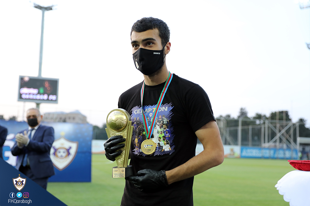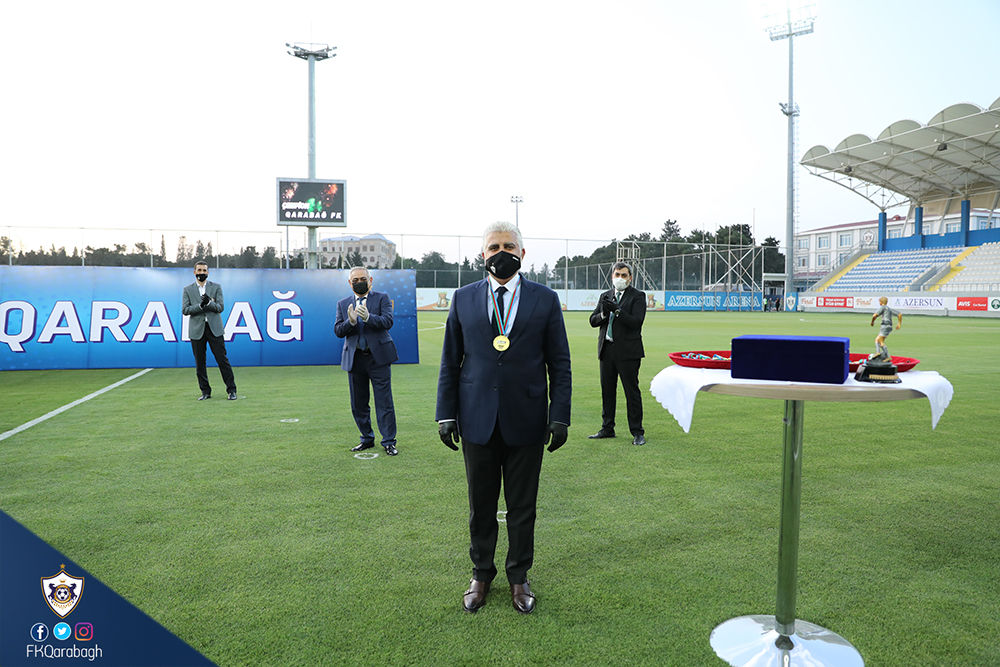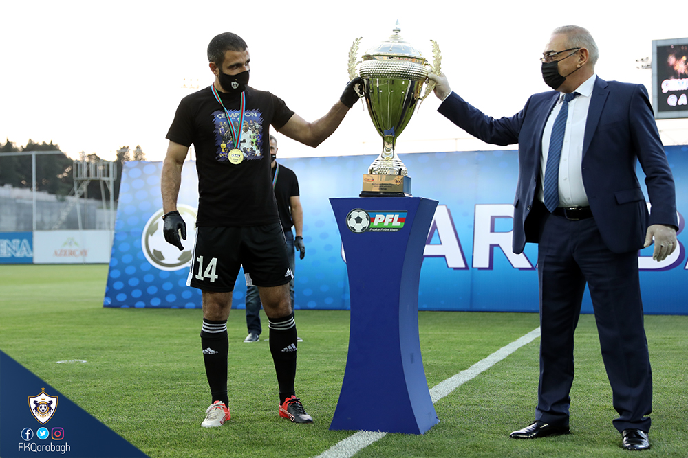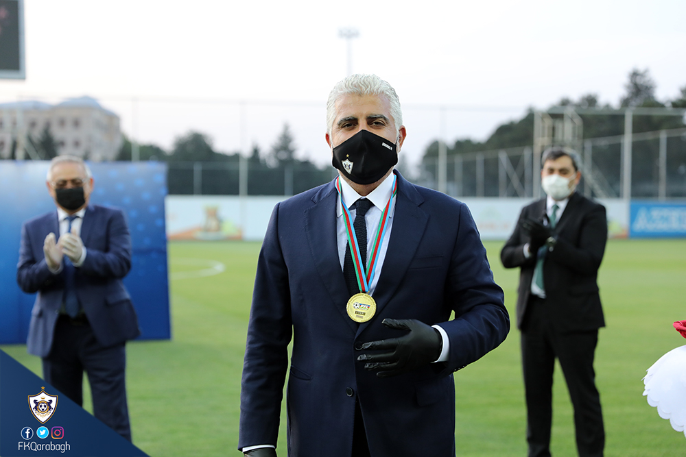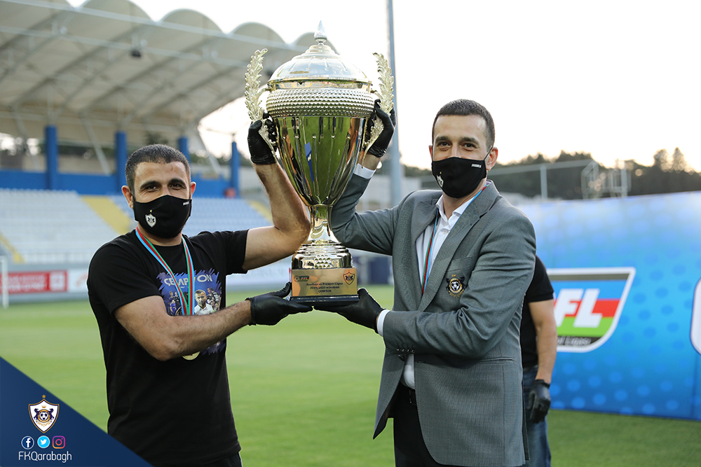 Bir neçə gün öncə Azərbaycan çempionluğunu rəsmiləşdirən Qarabağ Futbol Klubu bugün mükafatına qovuşub. Dünyada tüğyan edən Covid-19 pandemiyası ilə əlaqədar olaraq kütləvi tədbirlərin həyata keçirilməsi uyğun olmadığından komandamızın kuboku və medalları sadə mərasimlə təqdim olunub.